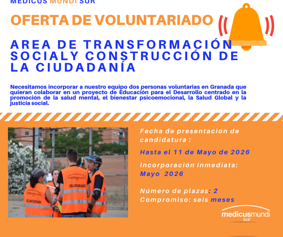 Desde Medicus Mundi Sur abrimos una convocatoria para incorporar a dos personas voluntarias en Granada que quieran colaborar en un proyecto de Educación para el Desarrollo centrado en la promoción de la salud mental, el bienestar psicoemocional, la Salud Global y la justicia social.